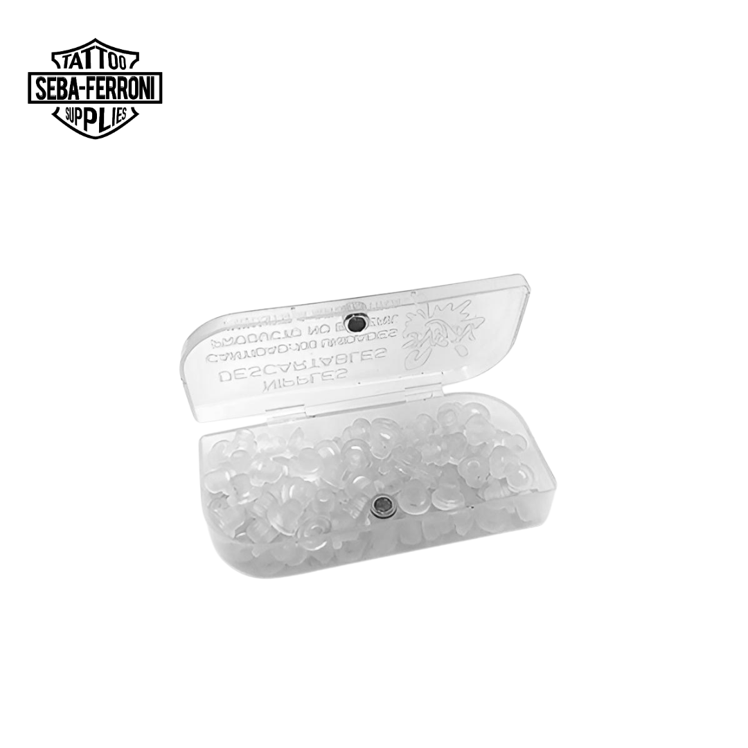 Disponibles en prácticas cantidades de 10 y 100 unidades, nuestros niples están fabricados con goma de alta calidad para ofrecer durabilidad y un agarre óptimo. Son indispensables para cualquier tatuador que busque mantener su equipo en perfecto estado y lograr líneas limpias y rellenos uniformes.